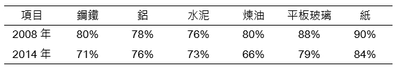 除此之外,根據中國歐盟商會分析,2014年鋼鐵、鋁、水泥、煉油、平板玻璃、紙等產品的產能利用率皆不及2008年,其中上述產業的企業資本額占總製造業27%以上,如表2。且在供需失衡、原物料行情低迷之下,2016年2月中國工業生產者出廠價格已連續衰退48個月。