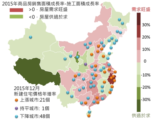 除了工業產品庫存之外,不動產庫存也是中國經濟另一項隱憂。根據統計,2012年以來,中國商品房待售面積以每年平均27%成長,至2015年已突破7億平方米面積。為解決不動產庫存逐漸攀升問題,中國官方近年陸續推出降息、降低首付比例、公積金政策調整等措施,但解決庫存問題效果有限。從圖1來看,中西部省市在商品房施工面積成長率高於銷售面積的情況下,仍面臨供過於求的庫存壓力。不過,一二線城市卻在上述政策,以及P2P網路金融工具的推波助瀾下,激勵房價走揚,其中2015年深圳漲幅居一線城市之冠,達46.8%。