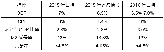 整體而言,中國面對經濟下滑及產業調整的兩難,不敢貿然實施大規模的改革政策,而是在穩定經濟發展的前提下,推動經濟改革。因此,在兩會上儘管可見官方針對經濟問題提出不少對策,但同時也擴大財政和貨幣政策,以減緩政策對經濟的衝擊,設定赤字占GDP比重目標從2.3%提高至3.0%,而M2成長率目標則從12.0%增加至13.0%,其他經濟目標如下表。