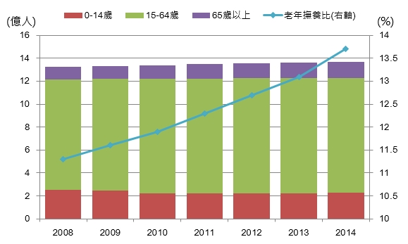 隨著國人平均壽命成長及少子化趨勢,我國人口高齡化程度愈趨明顯。近10年來我國生育率持續偏低,根據主計總處資料顯示,14歲以下幼年人口數從1996年3月423.3萬人,至2016年3月僅317.3萬人,減少逾百萬人,占總人口數比例也從18.8%降為13.6%,10年間占比減少5.2個百分點。另外據內政部統計,至2016年3月,10年間總人口數增加70.6萬人,其中65歲以上老年人口增加74.4萬人,占總人口數比例達12.7%,與14歲以下人口占比13.5%比較,老化指數已達94.0,相比1996年3月為52.9,老化指數數字10年間激增41.1。