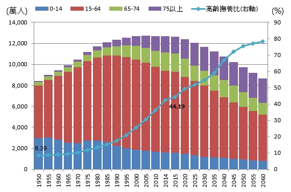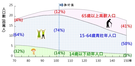 但要提到高齡化問題,同樣身為亞洲重要國家的日本,於更早之前就被迫面對人口高齡化現象。1995年日本平均每4.8位勞動人口(15~64歲)需扶養1位老人,到了2009年,平均每2.8位勞動人口(15~64歲)就需扶養1位老人,工作年齡人口於1997年之後成長鈍化,65歲以上高齡人口在2040年前會持續增加,2040年至2060年間的出生人數如持續下降,人口將轉為負成長,屆時日本高齡化的情形將日益嚴重,高齡化問題及人口結構失衡,對整體經濟、社會帶來莫大的衝擊,也帶來國家競爭力減損的危機,因此日本政府近年已積極提出因應策略。