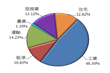 從台灣各部門能源燃燒排放CO2貢獻度來看,如圖1所示,若由部門分攤電力消費加以計算後,2014年能源部門之CO2排放約占燃料燃燒總排放的10.63%,工業占48.30%,運輸占14.23%,服務業占13.12%,住宅占12.62%,農業占1.10%。1990~2014年間,以服務業部門之年平均成長率較高,其次分別為住宅、工業及能源部門。