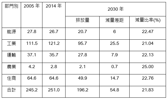 目前台灣僅提出整體溫室氣體減量目標,尚未針對細部產業來進行減量規畫。假設以齊頭式減量的方式來規劃,以2030年全國排放目標(2005年排放量減20%)乘以各部門最近三年平均排放占比能源部門占總排放量的10.53%,工業部門占總排放量的48.76%,運輸部門占總排放量的14.18%,農業部門占總排放量的1.08%,住商部門占總排放量的25.44%)來進行分配。如表3所示,以工業部門來看,2030年的排放目標為95.7百萬噸,與現況相比,排放量需要減少25.5百萬噸。整體來看,溫室氣體減量對於工業部門的衝擊最大,其次是住商部門、運輸部門,最後才是能源部門與農業部門。此外,工業部門中又以石化業、鋼鐵業、人造纖維業、水泥業及紡織業的溫室氣體排放最多,未來這些高耗能產業應趁早採用最先進及低能耗製程技術與設備,以符合最佳可行技術進行新設廠之規劃與建置,確保清潔生產與CO2減量。