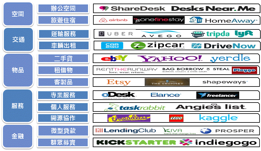 Taxi;共享房屋及辦公室空間的Airbnb、途家網及WeWork;共享網路存儲空間及軟件的Dropbox及Github;共享鄰里信息的Nextdoor等;提供金融P2P服務的Funding