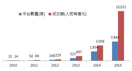 在中國,P2P借貸以驚人的速度增長。第一家中國的P2P網路借貸平台拍拍貸在2007年8月成立,到了2012年,P2P借貸已如雨後春筍般隨處可見。2015年統計中國擁有接近3,844家的P2P貸款平台,成交總額接近人民幣1兆元(如圖二所示)。