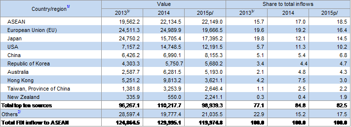 根據東協秘書處(ASEAN Secretariat)的統計,如表1所示,2013 至2015年間,在東協國家前十大外資來源國中,如排除東協國家本身之投資,以歐盟為最大外資來源,投資金額達638億美元;其次為日本的579億美元;美國、中國與香港則分別排名第4及第6大外資來源,投資額分別為341 、216及157億美元,台灣投資金額約73億美元,排名第9大外資來源。此顯示出2個現象,一是中國在東協勢力不斷地擴增,光中國及香港資金總額就遠超要「重返亞洲」的美國勢力,並緊追日本;其二是台商的產業南向政策已經逐漸增溫,有利於政府推動新南向政策。