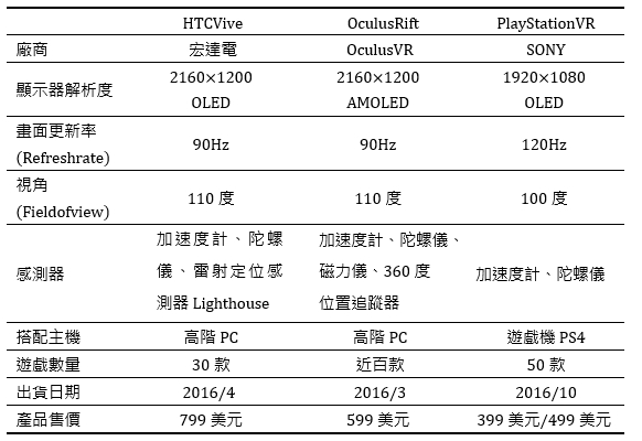 而宏達電2016年上半年所推出的VR頭戴式裝置Vive,在解析度、畫面更新、視角、定位追蹤系統等硬體性能上與OculusRift不相上下,在面對競爭對手出貨時程遞延之下,積極爭取重度遊戲玩家的認同,加速搶攻市場占有率。相較之下,遊戲機大廠SONY所開發的PlayStationVR則預計於2016年10月正式出貨,6月起開放預購,在上市時程上略微落後於宏達電與Oculus,在硬體規格上雖相對不如HTCVive與OculusRift,但因其產品售價相對較低,且具備龐大的玩家基礎,估計將成為2016年下半年全球VR市場的關注焦點。