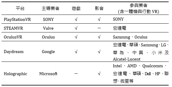 觀察過去智慧手機產業的發展經驗,蘋果成功建構一個涵蓋硬體、軟體、應用程式的平台,成為全球智慧手機市場成長過程中主要的受惠者。因此,隨著VR/AR產業崛起的過程,各家品牌大廠亦積極投入相關平台的建置,企圖在VR市場崛起的過程中取得相對有利的競爭地位。2016年全球主要VR/AR平台包括SONY所發展的PlayStationVR、PC遊戲平台廠商Valve旗下的STEAMVR、Facebook子公司Oculus所發展的OculusVR、Google所建立的Daydream平台以及微軟所推出的Holographic平台(見表3)。各家平台除擁有遊戲內容、影音內容之外,亦有相對應的硬體裝置支援廠商。