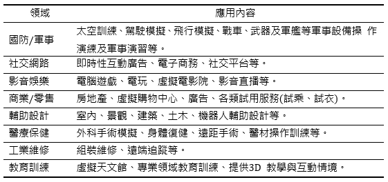 除了目前以影音、遊戲為主流的應用之外,隨著技術逐步成熟,廠商加速投入發展,VR/AR的應用逐漸多元,範圍亦涵蓋教育、商業、社交、工業、醫療、軍事等(見表4)。就遊戲應用方面,VR技術可以提供遊戲玩家一個全新、身歷其境的全新體驗,因而各大品牌陸續推出VR/AR頭戴式裝置,搭配內容與技術漸趨成熟,遊戲領域成為VR/AR的首要應用,成為品牌廠商必爭之地。在影音娛樂方面,隨VR影片內容陸續在Youtube、Facebook等平台上興起,帶動新型態的直播影音模式,透過VR技術引起觀眾的興趣,增加節目內容與觀眾的互動深度,也讓觀眾得以享受不同視角所帶來的體驗。