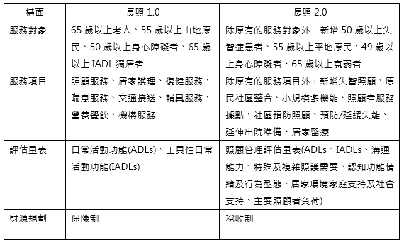 長照1.0版與長照2.0版之不同,在於服務對象擴大、服務項目增加、量表設計、財源規劃等方面有所差異,如表一所示,在服務對象上,長照2.0版將擴大受惠人數,服務對象人數預計將從51.1萬增加至73.8萬;在服務項目上,長照2.0版的服務項目將從8項增加至17項,向前延伸至預防階段、向後延伸至安寧服務;在量表設計上,改用照顧管理評估量表,更能夠將一些非外顯性的失能者納入長照體系來;在財源規劃上,過去的長照財源規劃是傾向參考健保做法,來支付長照服務,而現今的長照財源規劃則是以稅收制為主,根據行政政院會通過的長照財源,目前是從遺贈稅與菸稅來支應。