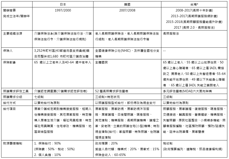 。關於日本、韓國、台灣長照制度之比較,詳如表二所示。