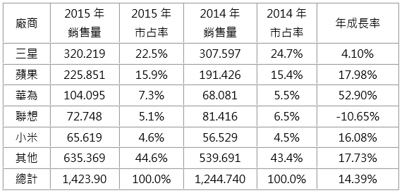 2015 年全球智慧型手機總體銷售表現,三星電子銷售3.202億支手機,市占率22.5%保持龍頭地位,其次是蘋果銷售 2.259 億支iPhone,在智慧型手機市場達