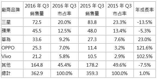 表2 IDC 2016年第3季智慧型手機前五大排行