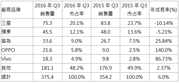 Analytics亦認為2016年第3季智慧型手機出貨量達3.75億支,年成長率達6%。