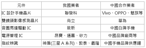 在需求轉移至中國手機品牌之下,亦使我國相關業者間接得到新的商機。如IC設計相關供應鏈手機晶片聯發科、尚立、致新等皆成功地打入中國手機品牌供應鏈間接受惠。表4則列出兩岸在手機產業鏈的合作對象。