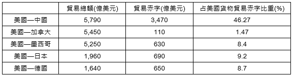 就商品貿易數據來看,美國的前五大貿易夥伴中同樣存在最大的貿易赤字(如表一所示),其中又以中國為最高,約有46%的美國商品貿易逆差是在中國,美國與中國的貿易逆差將近3,470億美元,這些赤字主要是由高達4,620億美元的進口所產生的,包含消費電子、服裝及機械。事實上,許多進口產品都來自美國製造商,它們向中國運送原料以便進行低成本裝配,當這些產品運回美國時,就被視為進口。