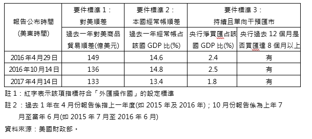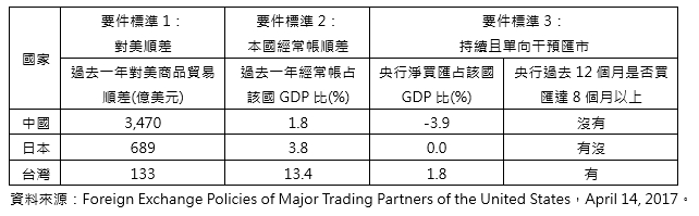 Trading Partners of the United States,以下簡稱為「外匯政策報告」),評定本次審視期間(2016年1月至12月)美國的貿易夥伴國之中,沒有同時構成「2015貿易促進暨執行法」(Trade