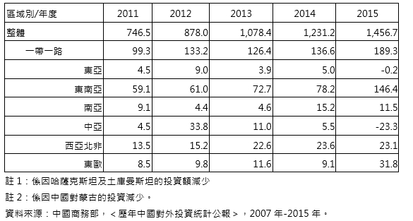 表1 2011-2015年中國對「一帶一路」沿線國家的直接投資