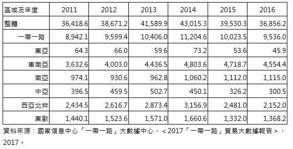 不與「一帶一路」沿線國家貿易方面,貿易額從2011年36,418.6億美元,增加至2016年36,856.2億美元,成長1.2%,其中對「一帶一路」沿線國家投資額從8,942.1億美元成長至9,536.2億美元,增加6.6%,占比則從24.6%增加到25.9%。從區域別觀察,對東南亞貿易成長25.4%,占比從40.6%增加至47.8%最多,對南亞貿易成長14.5%,占比從10.9%增加至11.7%次之。