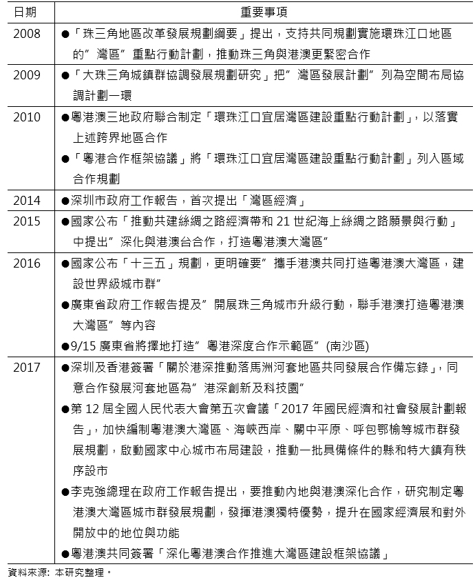 2015年粵港澳大灣區首次被納入中國政府文件中,依「推動共同絲綢之路經濟帶和21世紀海上絲綢之路願與行動」,正式在「一帶一路」建設中提出”打造粵港澳大灣區”;同年,澳門與深圳市政府共同簽署「關於深化深澳合作共同參與粵港澳大灣區建設備忘錄」。2016年中國發布「關於深化泛珠三角區域合作的指導意見」,提出”攜手港澳共同打造粵港澳大灣區,建設世界城市群”,同年的國家「十三五」規劃綱要也提出”支持港澳在泛珠三角區域合作中發揮要作用,推動粵港澳大灣區和跨省區重大合作平台建設”。2017年十二屆全國人大第五次會議上通過的政府工作報告中提到”要推動內地與港澳深化合作,研究制定粵港澳大灣區城市群發展規劃,發揮港澳獨特優勢,提升國家經濟發展和對外開放的地位與功能;7月份粵港澳共同簽署「深化粵港澳合作推進大灣區建設框架協議」,包括以廣州為輻輳地、港珠澳大橋連結的珠海、大灣區深圳、惠州及粵、港等城市,進一步深化中國廣東與港、澳的交流合作,不僅可為香港、澳門發展注入新的動能及發展空間,提升港澳國際競爭力,也有利於擴大三地的開放,匯聚全球更多的創新資源,接續紐約灣區、舊金山灣區、東京灣區等國際灣區的發展。粵港澳大灣區發展的歷史演進,如表1所示。