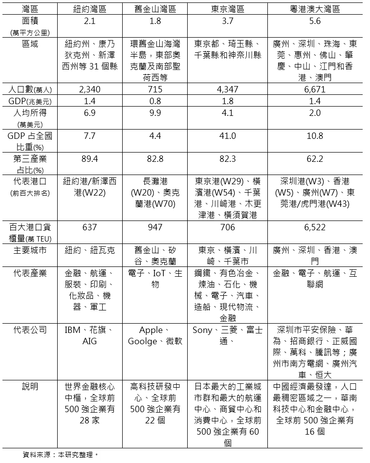 灣區經濟係因若干相連海灣、港灣與毗鄰的島嶼所形成的超級港灣,再與廣闊的腹地,發展出貫通的都會城市群所衍生經濟帶效應。像美國的紐約灣區、舊金山灣區和日本的東京灣區等皆為全球公認的佼佼者。粵港澳大灣區建成後,與國際知名的灣區競爭優勢分析如下。