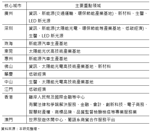 區內生態環境不僅提供現有產業集群轉型升級,亦可培養新領域、新產業集群茁壯成長,包括產業供應鏈完整有利於現代產業體系建構、ICT及科研產業集群有助於打造國際科技創新中心,以及集結大量專業服務和國際人才的香港與澳門,從各核心城市未來發展重點領域如表3所示,未來將吸引更多海內外投資者和商貿活動在大灣區內集聚,為區內各城市帶來更多發展空間和機會。因此,如美國蘋果公司在深圳設立華南的運營中心、微軟公司物聯網實驗室等,未來將結合香港國際金融業和創投基金,投入粵港澳大灣區所要發展的新一代資訊技術、生物技術、高端裝備、新材料、節能環保、新能源汽車等戰略新興產業集群,並使深圳成為帶動粵港澳產業升級的創新中心。