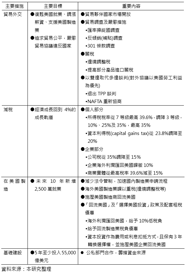 川普總統上任後,即提出「美國優先」作為施政的主軸,不管是貿易、稅務、移民或外交事務,都會以「美國製造」為原則,除了嚴苛要求貿易夥伴國家市場自由化、對貿易逆差國家採取調查和制裁行動,其目的在保護美國市場,打開國外市場,以確保美國工人的就業機會,並企圖跳脫WTO的多邊體系規範,像退出跨太平洋夥伴協定(TPP),以及考慮對企業海外代工產品回美銷售徵收「邊境稅」,減少貿易逆差等貿易保護措施,另一方面他提出減稅導引資金回流或透過選擇美國(Select