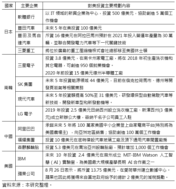 因此,當美國川普總統向蘋果、軟銀、阿里巴巴等知名企業家招手,「歡迎投資美國」,到後來他再提出降稅等利多條件誘因下,不僅跨國美國企業回流開始回溫,也提高許多日韓等亞裔企業前往美國投資意願,如表2。依據日本財務省公布2016年國際收支為例,日本對美國的FDI達到5.7兆日元,比2015年增長5.6%,而美國對日本FDI則為6,325億日元,僅達1成之多,連日本Recof公司統計2016年日企對美國企業的併購計206件,比2015年成長24.8%。尤其2016年12月,日本軟銀宣布將以IT領域的新興企業為中心向美國進行500億美元的投資案,今年1月豐田汽車公布未來5年內100億美元投資計畫[5],並與馬自達合力斥資16億美元在阿拉巴馬州聯合開發電力汽車等下一代關鍵技術等。