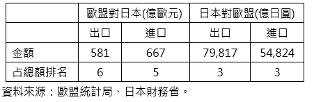日本與歐盟作為全球第四與第二大經濟體,雙方之間的貿易往來也相當密切(如表1),因此,自2013年4月起便開始進行「日歐經濟夥伴關係協定」(Economic