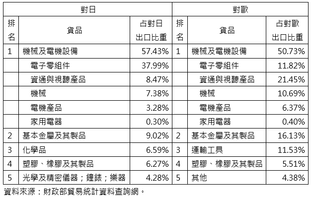表2 台灣對日本與歐洲前五大出口貨品比重
