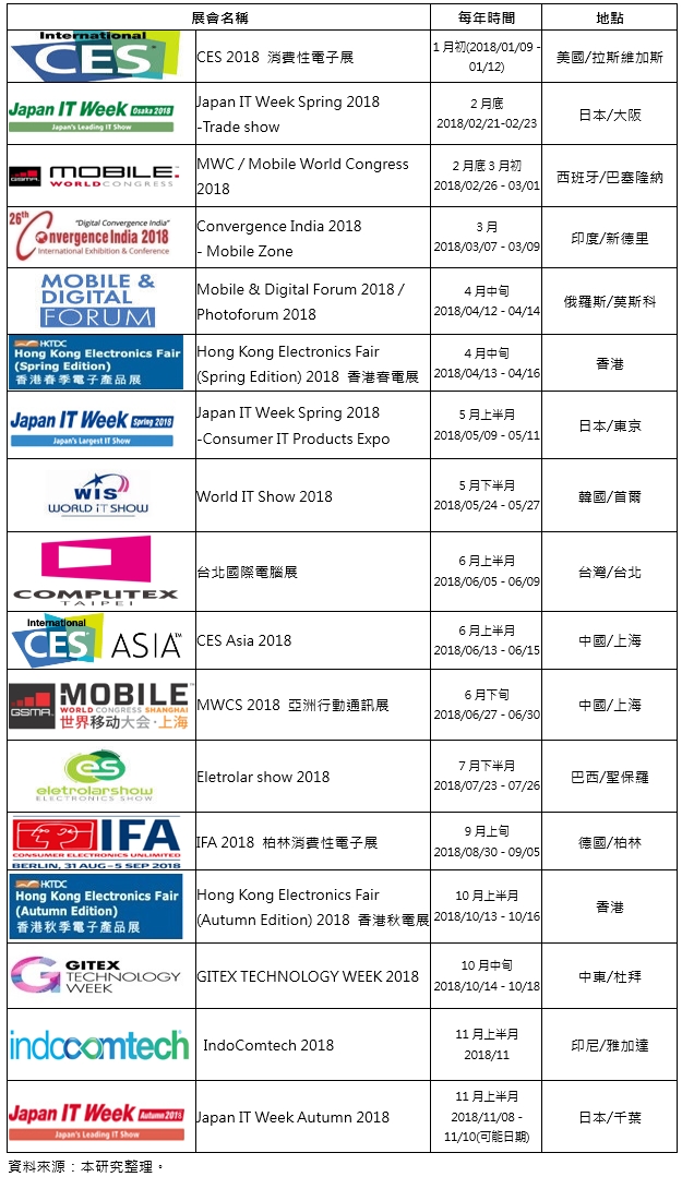 為迎合全球智慧化(Smart)、開放化(Open)、創新化(Innovation)趨勢,消費性電子產品不斷地透過物聯網、大數據及人工智慧(AI)等資訊技術應用而翻新,因此,每年從1月份的美國消費性電子展CES展拉開序幕,幾乎每個月在全球主要地區有舉辦類似展覽會,讓產品能從生產端走向消費端體驗,展示給經銷商、買家、消費者。以下就明(2018)年度主要的消費性電子展排程及以主要三大主要展場做一簡要介紹。