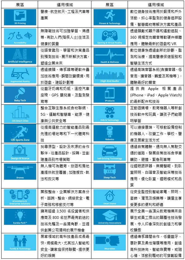 美國CES展為目前全球最大的消費性電子展,許多產品如1970年錄影機(VCR),到1980年攝影機,2001年的電漿電視,到近期如福特Focus電動車、自駕車、無機人及機器人等在此進行首次展示,另也展示新技術市場的組合區,包括提供新興產品,服務和公司等。2018年展場將區為24個展區,從3D列印、到智能家居及生活等應用和技術發展介紹,如表2所示。