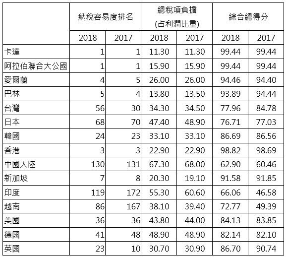 資料來源:世界銀行及普華永道聯合發表,2017及2018年全球繳稅調查報告。