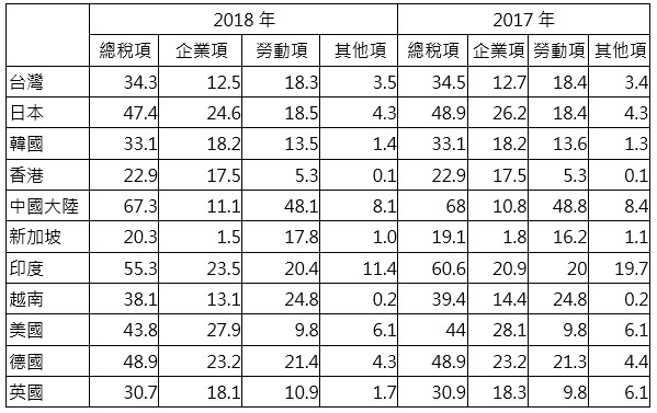 在企業繳稅的總稅項負擔占利潤比重方面,全球平均為40.6%僅高於2017年0.1個百分點,其中以卡達11.3%最低。台灣為34.3%,較2016年微降0.2個百分點,低於中國(68%)、日本(48.9%),美國(43.8%)等,但高於韓國(33.1%)、香港(22.9%)、新加坡(19.1%)。再分析其細稅項負擔占比,企業稅項負擔中卡達、阿聯及巴林為零稅率,台灣為12.5%,不僅低於日本(24.6%)、韓國(18.2%)、香港(17.5%)、美國(27.9%)等國,但高於中國(11.1%)、新加坡(1.5%)。