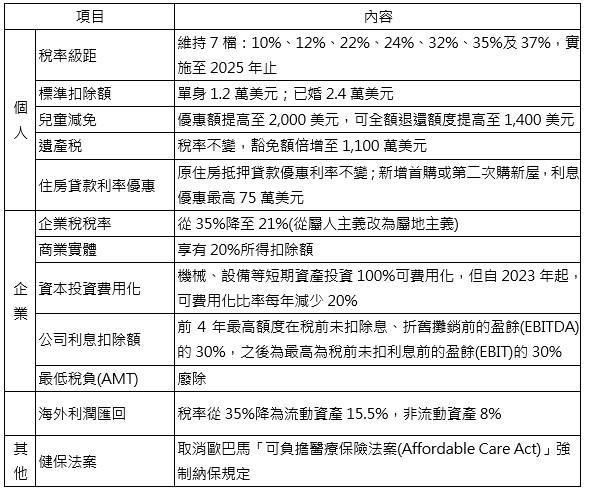 Tax Credit)及遺產稅免稅額。在企業所得稅方面,稅率從35%降至21%,商業實體所有人享20%的所得扣除額,並廢除20%的公司最低稅負制(AMT),且准許企業新設備成本立即扣除及訂定防止稅基侵蝕(Base