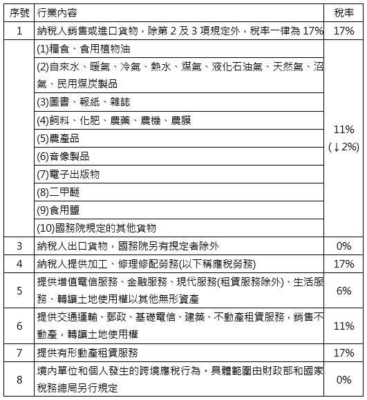 為避免營業稅在貨品及服務的重複課稅問題及降低企業稅負,中國自2012年於上海首先針對交通運輸業和部分現代服務業啟動營業稅改徵增值稅(營改增),並逐步擴大試點區域與行業範圍。2016年5月1日起再將建築業、房地產業、金融業、生活服務業等納入範圍,達到全面改徵增值稅措施;2017年7月起再將增值稅由四級稅率(6%、11%、13%與17%)減至三級及降低農產品及天然氣等稅率;10月底宣布廢除《營業稅暫行條例》並修訂《增值稅暫行條例》,讓實施60多年的營業稅正式走入歷史。其各行業開徵稅率如表4: