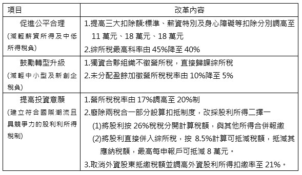 我國稅改雖在草案階段,依行政院所規劃的稅改內容,主要有三大改革主軸,包括促進公平合理,調整所得者稅負結構,如調高標準、薪資所得及身心障礙等扣除額,並調降綜合個人所得稅(綜所稅)最高稅率降至40%;第二是減輕中小型及新創企業稅負,除獨資合夥事業免營所稅,盈餘直接歸課綜所稅外,未分配盈餘加徵營所稅稅率降至5%;最後在建立符合國際潮流且具競爭力之投資所得稅制,除廢除兩稅合一部分設算扣抵制度,改採股利所得課稅新制,及營所稅稅率由17%調高至20%外,並調高外資股利所得扣繳率至21%。如表5