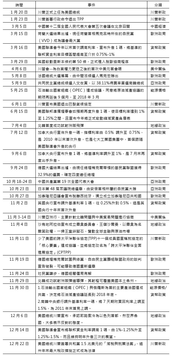 回顧2017年所發生的國際重要政經事件,事件先後發生順序詳如表1所示,本研究將這些事件歸類為川普新政、貨幣政策、美中關係、歐洲政局、亞洲政局、地緣政治與能源價格等項目。以下將就各分類項目來簡要分析可能對於全球與我國的經貿影響: