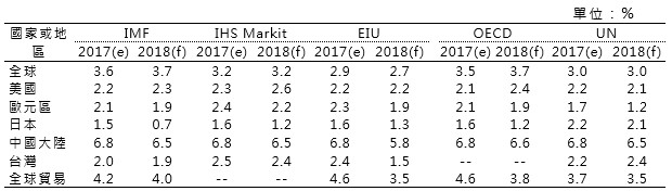資料來源:IMF、IHS Markit、EIU、OECD、臺經院整理,2018年1月。