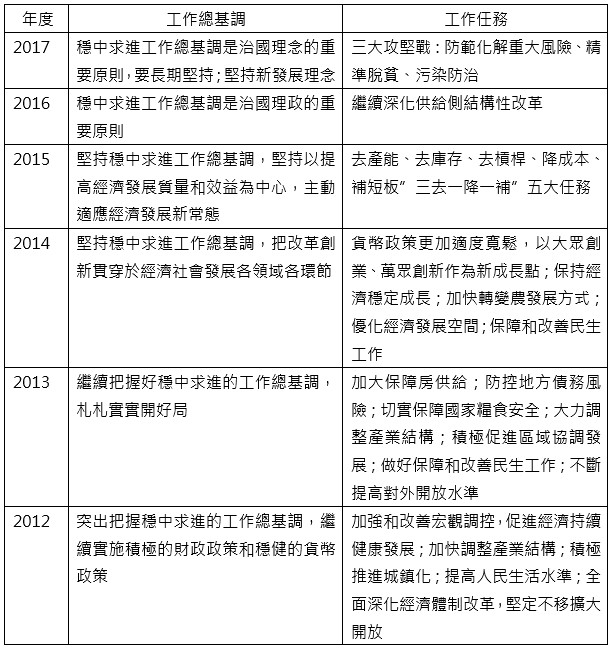 從2011年開始提出「穩中求進」工作基調,其後每年皆會提及,習近平主席曾闡述所謂的「穩中求進」,“穩”要穩住經濟運行,“進”要深化改革開放和調整結構,而”穩中求進不是無所作為,不是強力維穩、機械求穩,而是要在把握好度的前提下有所作為,恰到好處,把握好平衡,把握好時機,把握好度”。因此,在穩中求進的工作總基調下,即在穩的前提下要在關鍵領域有所進取,在把握好度的前提下奮發有為。[註1]