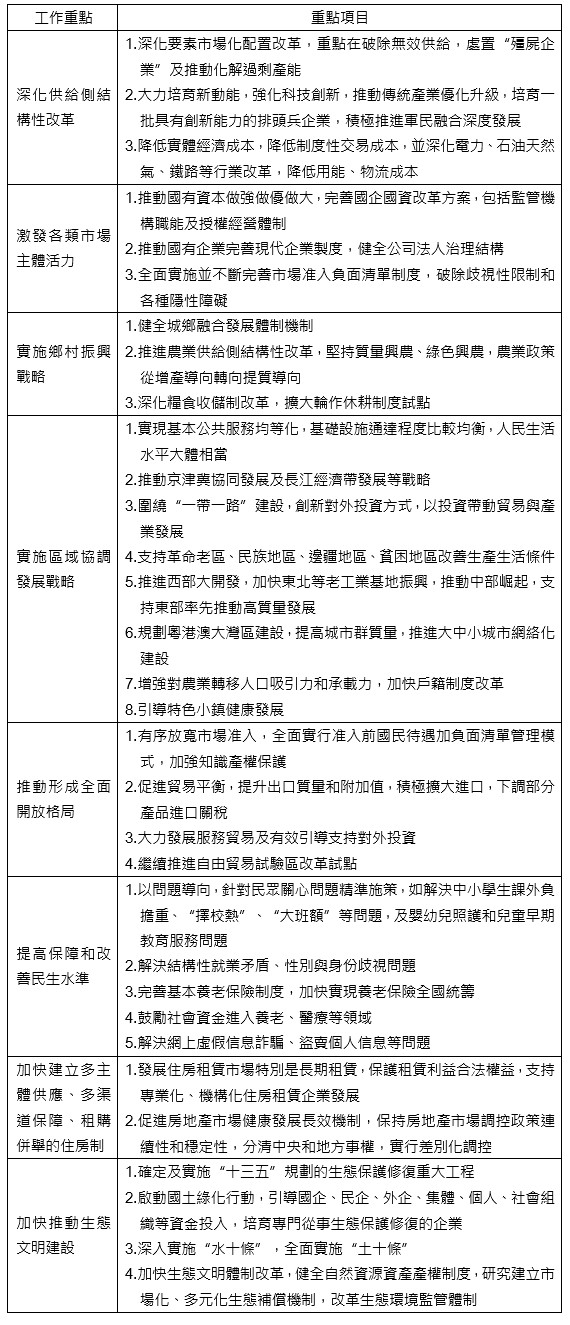 因此,依據工作會議內容,歸納出2017年的主要的經濟工作,今後 3 年要做好「決勝全面建成小康社會」的防範化解重大風險、精準脫貧、汙染防治三大攻堅戰。因此,在總體政策方面,主要為了守住不發生系統性金融風險的底線,防範化解重大風險;在社會層面上,要保證現行標準下的脫貧質量;另也要打贏藍天保衛戰,調整產業、能源及運輸結構。其主要工作項包括: