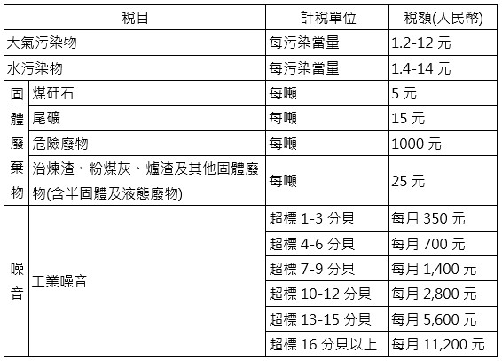 調整產業結構。而 2018 年 1月 1日起實施《中華人民共和國環境保護稅法》及《環境保護稅法實施條例》,正是體現中國政府強化環保監管的具體作法。根據該法規定,中國政府主要徵收對象包括大氣污染物、水、固體廢棄物和噪音等4大類,並廢止《排污費徵收使用管理條例》排污費徵收。這是中國第一部「綠色稅制」,顯示中國政府環保政策的變遷,環境污染問題的重視。