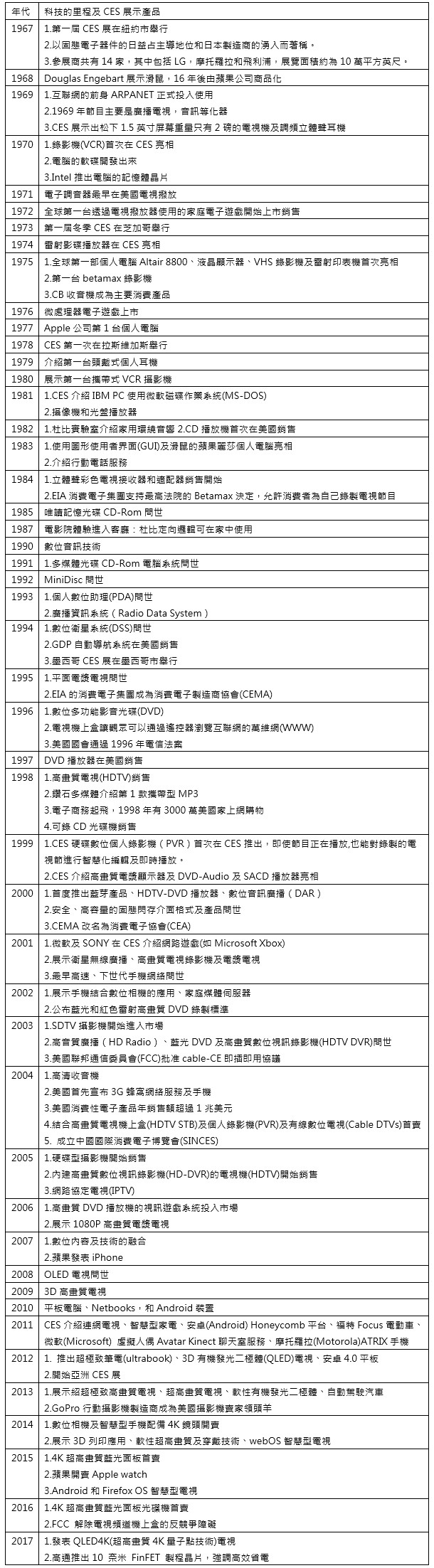 CES展雖沒有德國IFA展的歷史,但迎合科技產業發展里碑,展場成為新創公司、小國廠商產品能獲得世界關注的管道,從1967年至2017年有不少結合創新領域的科技產品不斷曝光,如同CES全球媒體揭示會場所展示的各種得獎產品,都顯示未來生活在科技領頭下將有更多改變,每一件新產品都令人驚嘆。以下就CES歷來所發表的科技簡要臚列如表1。
