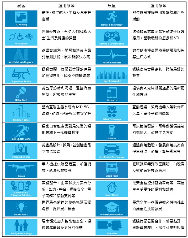 美國CES展為目前全球最大的消費性電子展,許多產品如1970年錄影機(VCR),到1980年攝影機,2001年的電漿電視,到近期如福特Focus電動車、自駕車、無機人及機器人等在此進行首次展示,另也展示新技術市場的組合區,包括提供新興產品,服務和公司等。2018年展場規劃為24個展區,從3D列印、到智能家居及生活等應用和技術發展介紹,如表2所示。