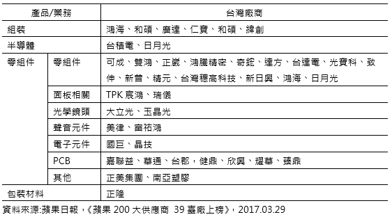 資料來源:蘋果日報,《蘋果200大供應商 39臺廠上榜》,2017.03.29