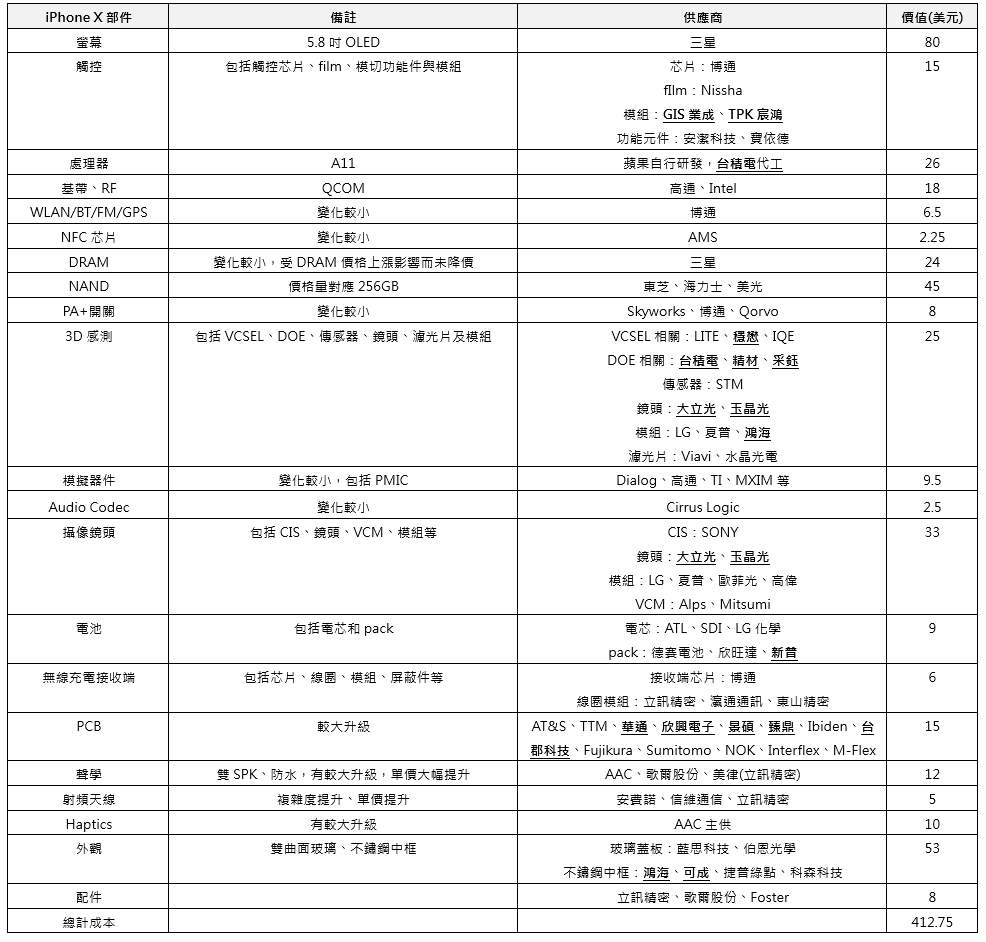 根據中國媒體流傳的iPhone X成本清單來看,iPhone X的零組件中,在主晶片處理器、觸控模組、3D感測(鏡頭、模組、面射型雷射(VCSEL)
