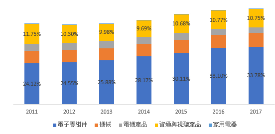 台灣經濟以出口為導向,和蘋果公司的代工關係密切,觀察台灣近7年來的出口貿易總額,每年約介於2千8百億美元~3千2百億美元之間,其中出口最主要貨品項目為機械及電機設備,出口比重約佔總出口5成以上,且比重有逐年增加趨勢。該出口項目中,又以電子零組件為主要出口貨品,電子零組件貨品出口占總出口比重,則從2011年的24.12%增加至2017年的33.78%(詳如圖1所示)。另外,若從股票市場來看,自2012年後,蘋果公司股價與台灣電子零組件出口息息相關(如圖2所示),顯示兩者有很強的關聯性。