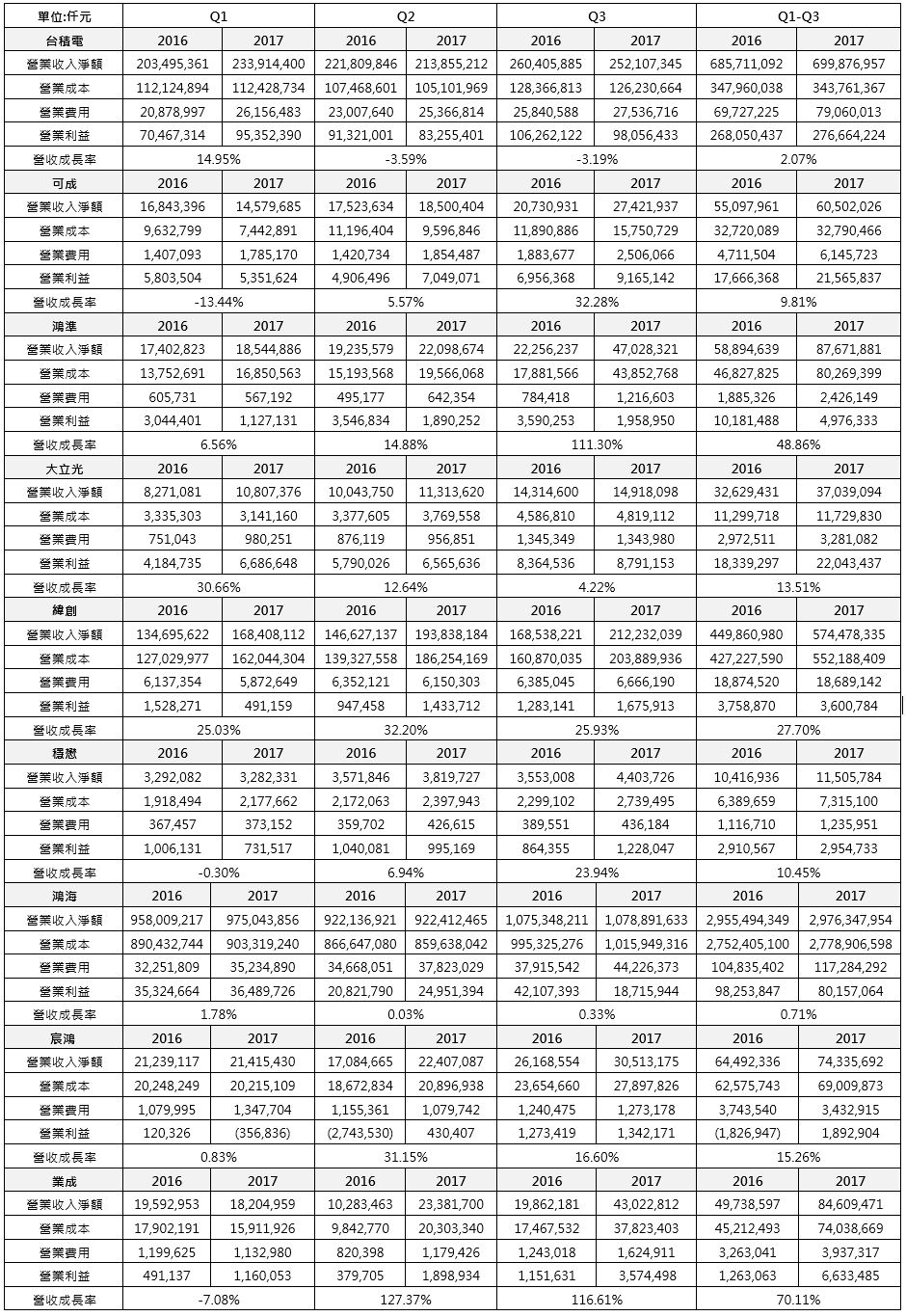 表3 台廠蘋果供應鏈廠商2017年前三季營收表現