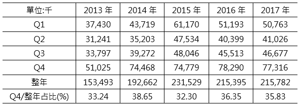 就蘋果iPhone手機銷售量來看,手機銷量從2013年1.53億支,快速增加至2015年的2.31億支,不過2016年銷量則略有下滑來到2.15億支,從各季銷售情況觀察,由於第四季為每年的蘋果新機發表與銷售旺季,所以購買新機的人數較多,因此第四季銷售量占整年銷售比重最高,平均約有35%左右。然就蘋果公司所公布的資料顯示,2017年第四季共銷售了7,730萬支iPhone,低於分析師預期8,100萬支,使得2017年蘋果手機銷售量僅成長0.18%,成長表現不如以往 (如表4所示)。