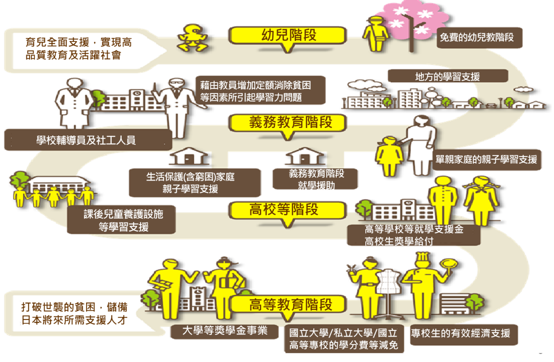 日本為解決少子化問題,在2015年即有對有0-1歲幼兒的家庭,規劃短工時等多元化工作型態及易返職場的育嬰留停相關措施,另對育兒家庭的補貼方面,對弱勢家庭或單親家庭從2017年起,提供包括0-3歲每人每月1.5萬日圓(約新台幣4,100元)、3歲到中學生畢業每人每月1萬日圓(約2,700元)。而2017年12月8日內閣會議通過的「育人革命」政策,如圖1所示,主要係對育兒提供全面性支援,實現高品質的教育水準以及活躍的社會,並要打破貧困的世襲,儲備未來國家發展所需的人才為目標。